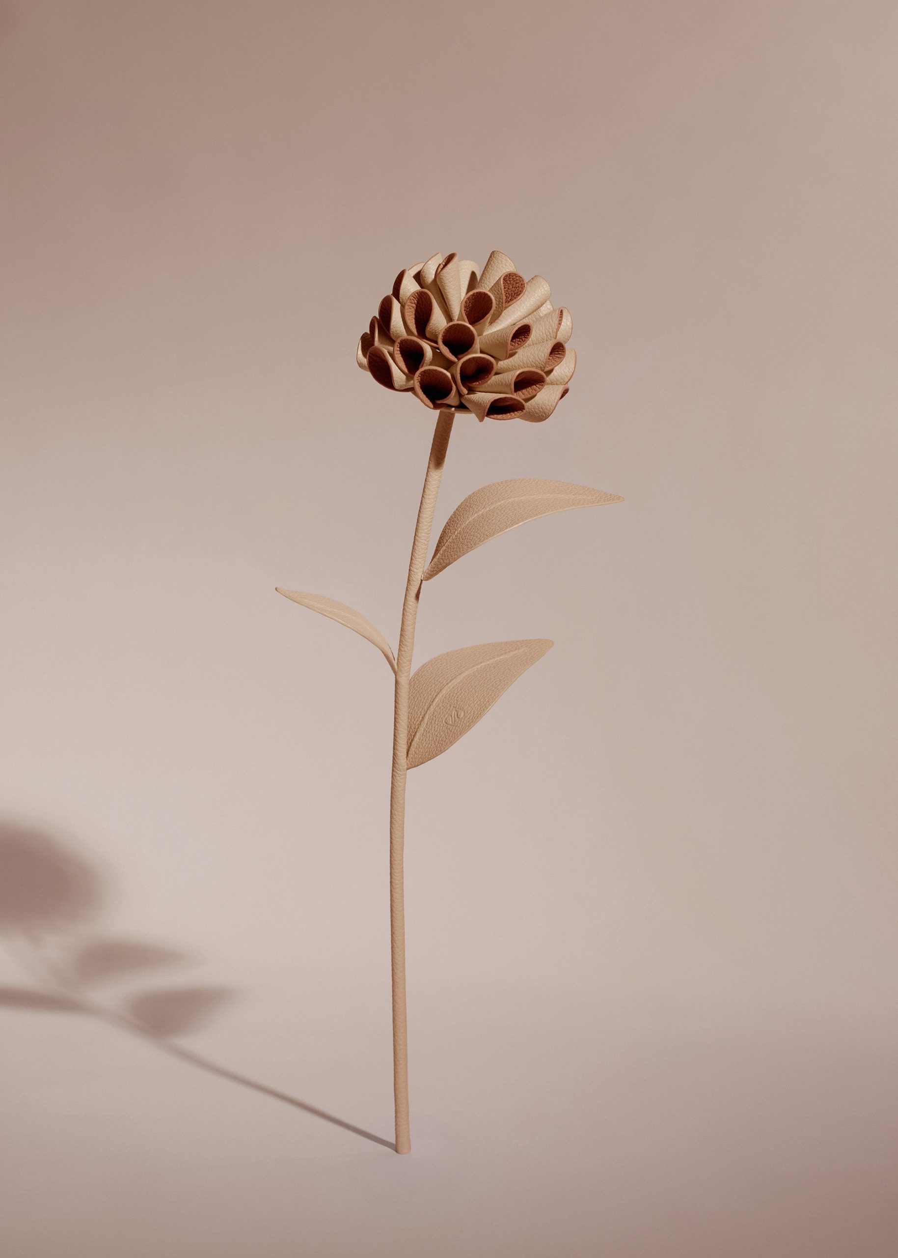 From the Plei collection. made entirely from upcycled leather off-cuts. the Dalium flower is inspired by the dahlia’s sculptural geometry. The tubular petals combine contrasting leathers with a meticulous set of folds and stitching. Hand-stitched ribbed leaves adorn the slightly curved leather-covered stem.