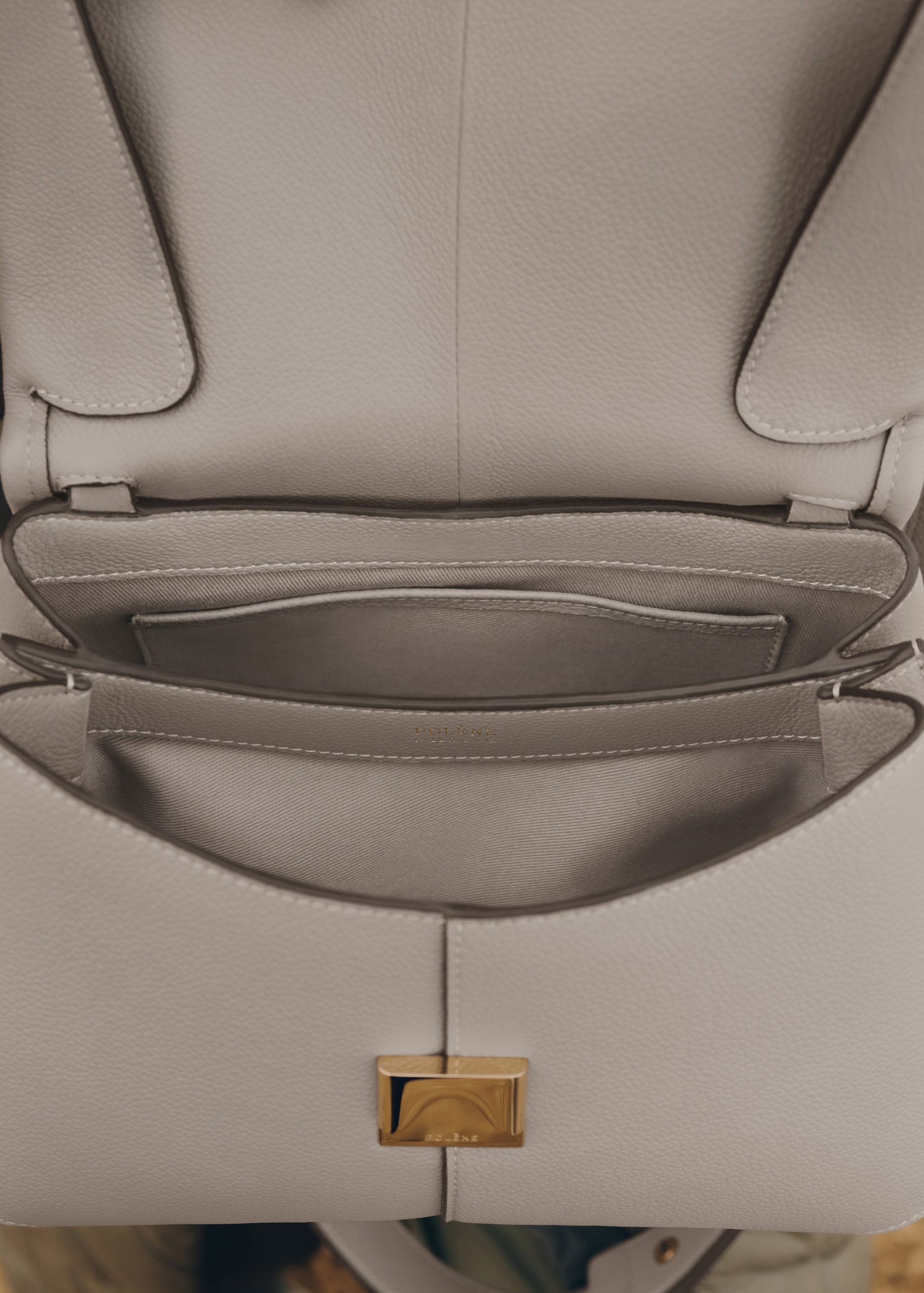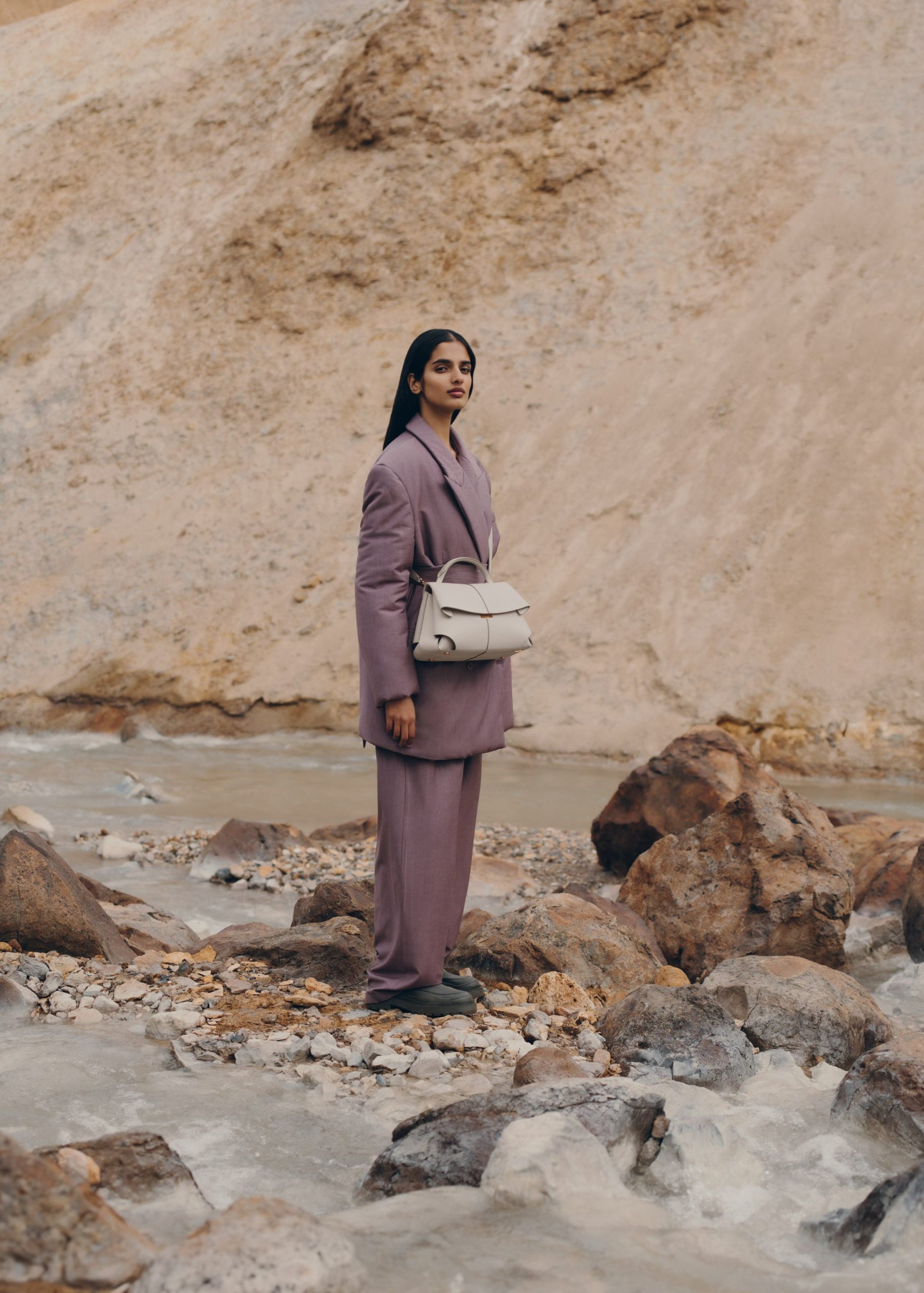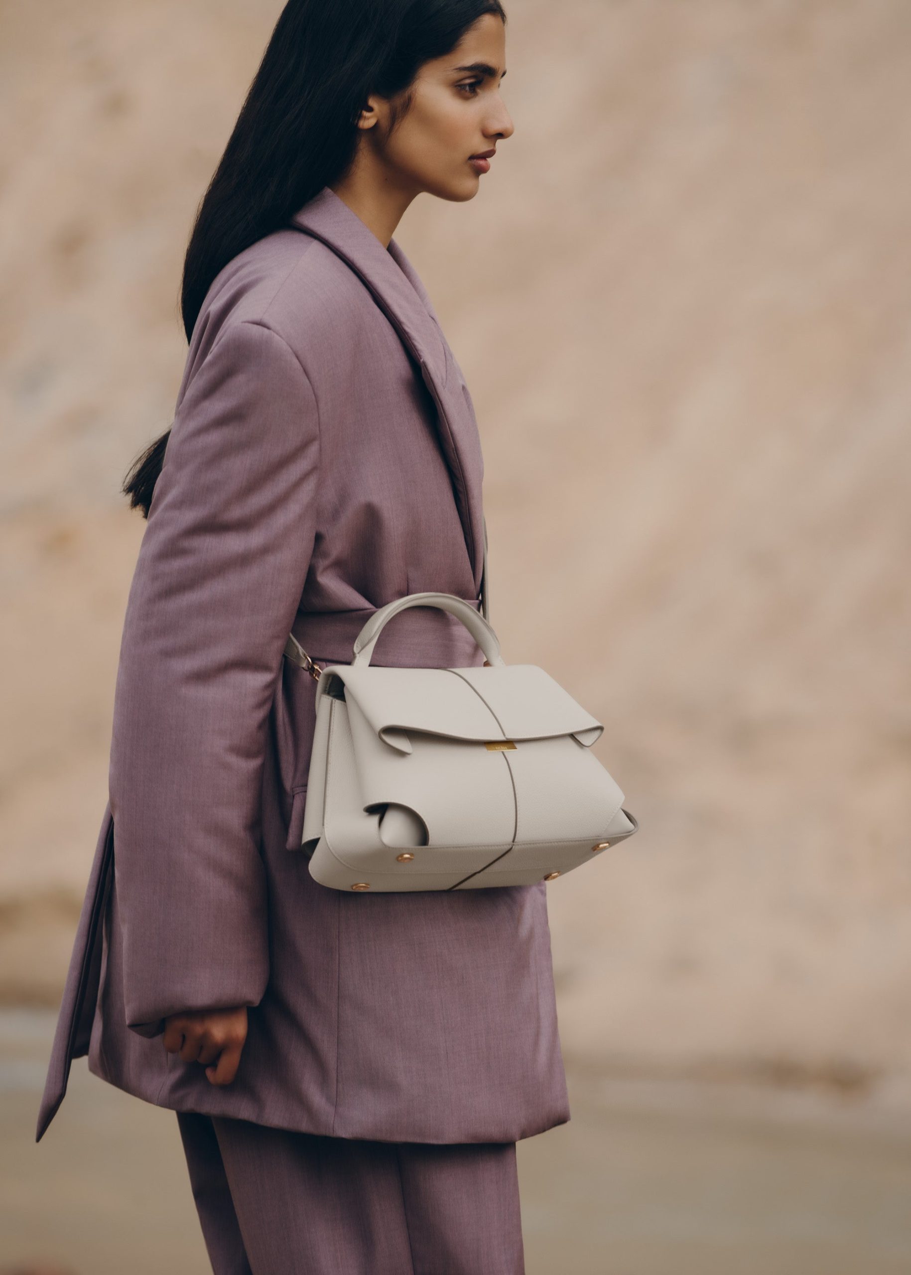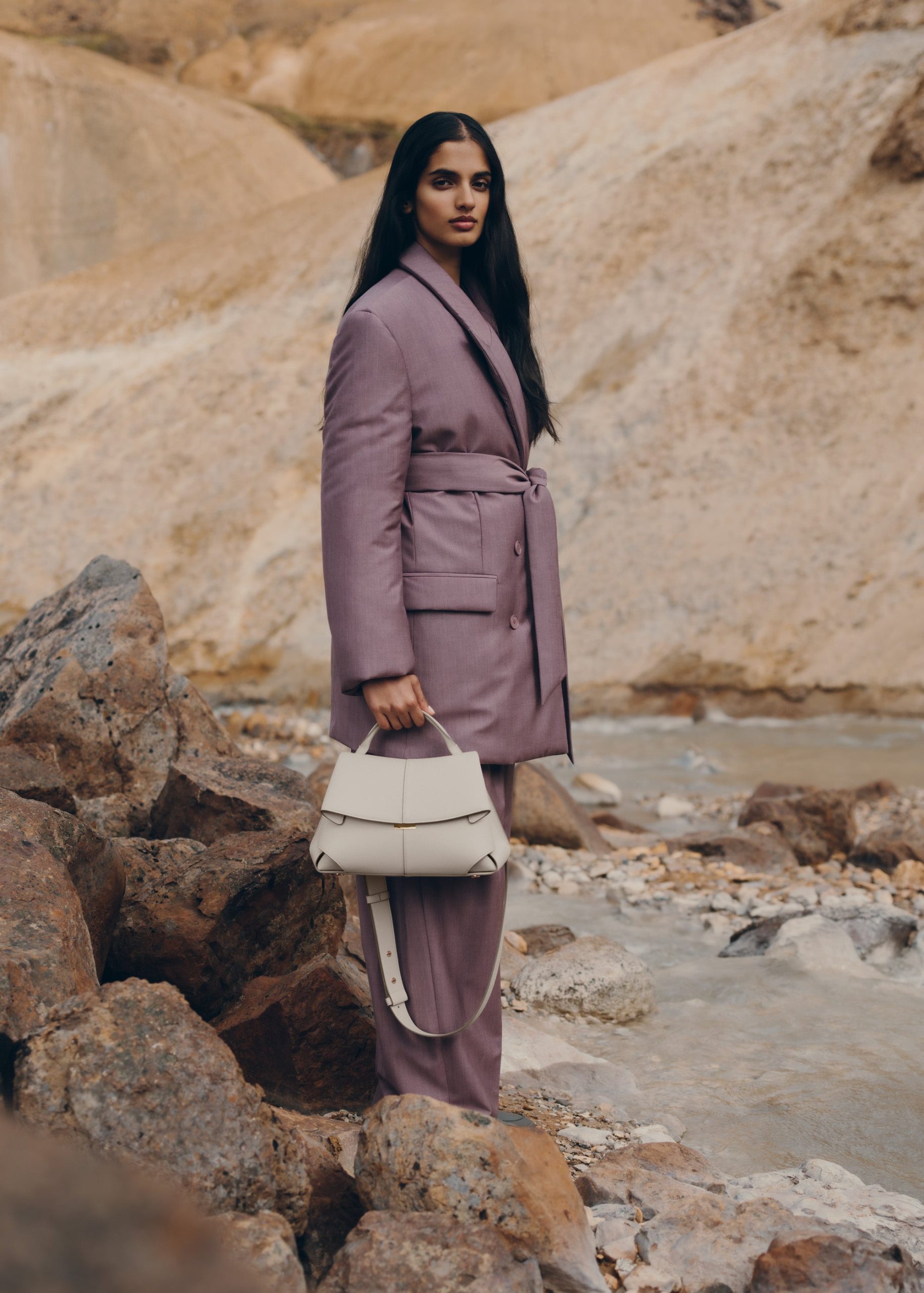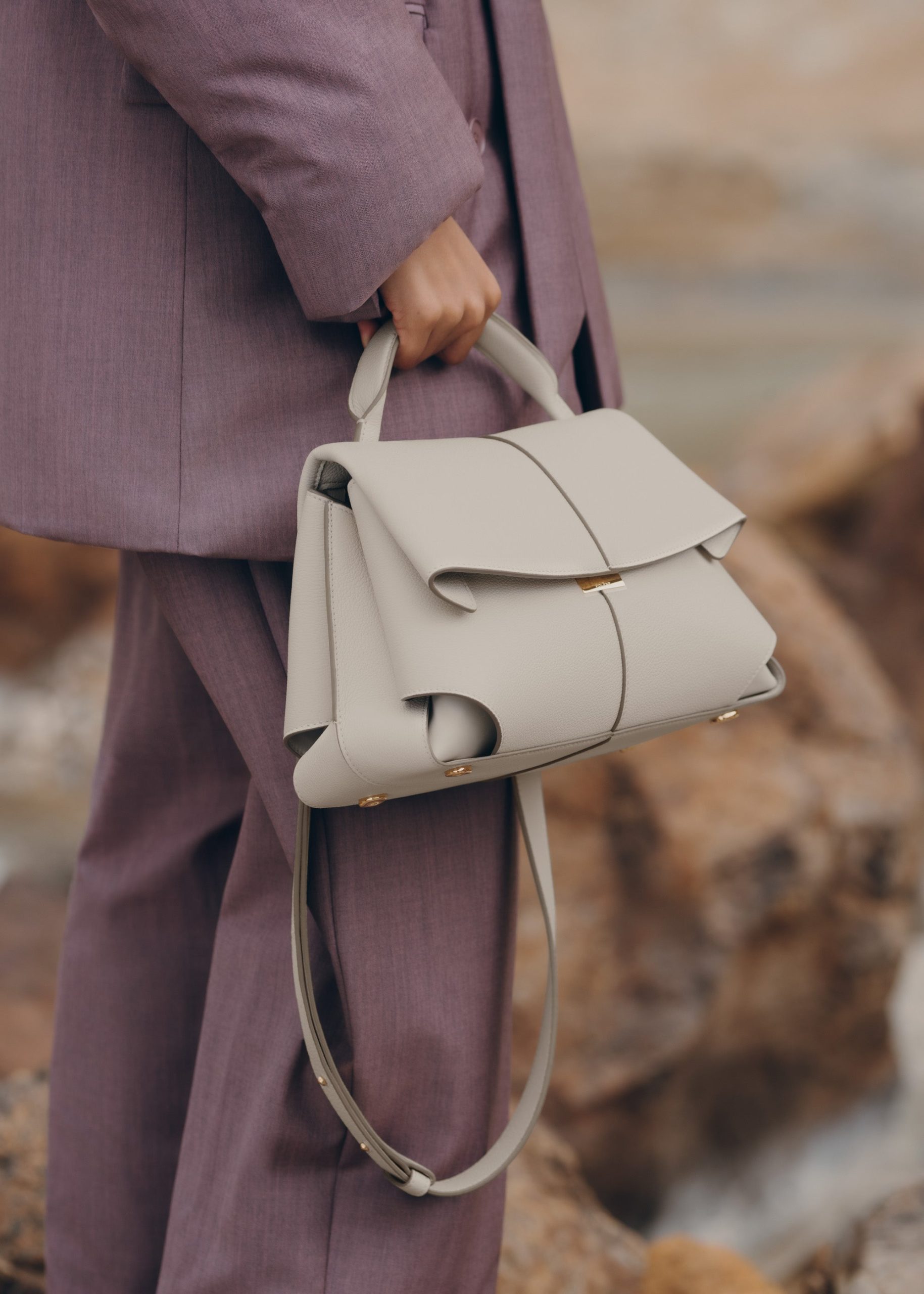 The Mokki model showcases the art of folding with its textured leather. The corners are cut to reveal smooth leather for a subtle interplay of textures. The bag’s interior is roomy and divided into compartments. all protected by a flap that features an engraved clasp. With its adjustable shoulder strap held in place by snap hooks. the model smoothly adapts to your movements.