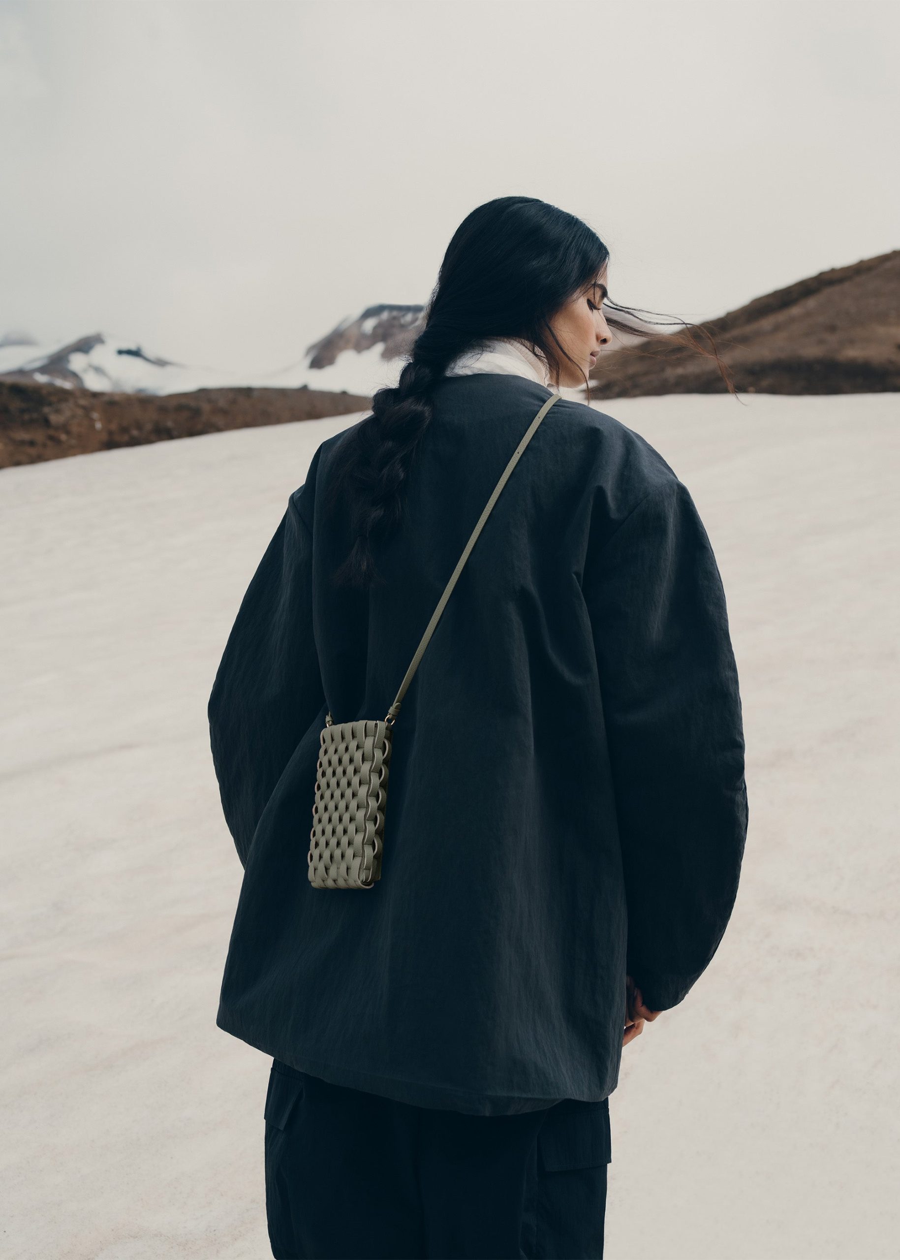 The Onda phone case is shaped by woven strips to form an undulating leather relief texture on the exterior. Worn crossbody or around the neck. this accessory can also be used as a card holder.